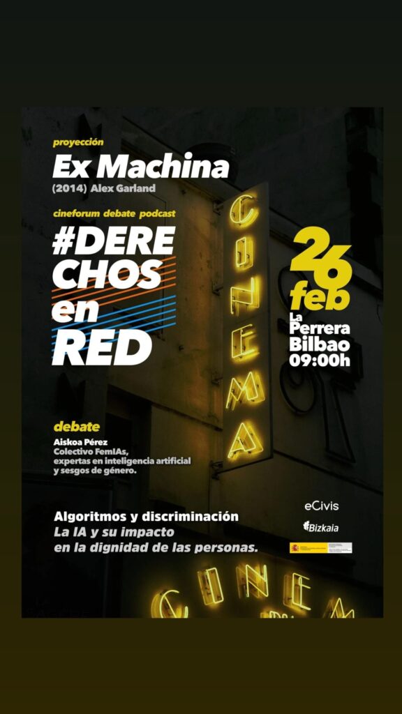 En un momento clave en el que somos conscientes de que el algoritmo no es neutro, y que los sesgos y estereotipos terminan por excluir y generar distorsiones graves en la convivencia digital (y no digital), os invitamos a participar del debate que tendrá lugar en la sala Konekta en La Perrera (Bilbao), el próximo jueves 26 de febrero a partir de las 9.00 horas, con la intervención de Aiskoa Pérez, de Colectiva FemIAs, y bajo la moderación de Oskar Fernández, moderador del Cine Fórum de Getxo durante más de 40 años.